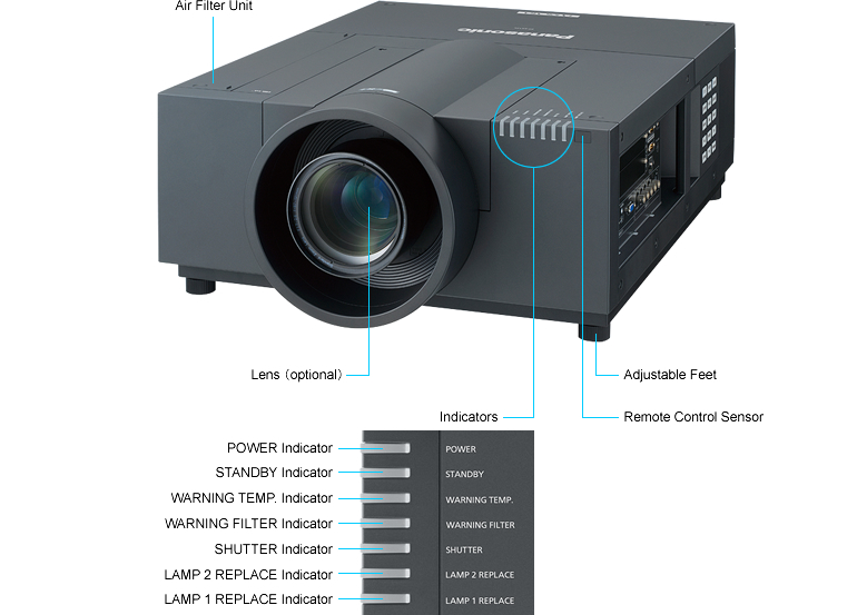 Optical axis shift | With the ET-ELW06: vertical ±39% from center of screen (powered)*3With the ET-ELW02/ELW04/ELS03/ELM01/ELT02/ELT03: vertical ±39%, horizontal ±10% from center of screen (powered)With the ET-ELS02: vertical ±50%, horizontal ±10% from center of screen (powered)With the ET-ELW03: the optical lens shift function cannot be used. | |||||||||||||||||